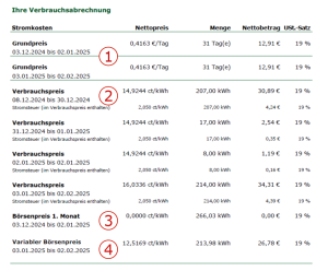 Neben dem Grundpreis (1) finden Sie mindestens einen Eintrag mit dem Titel Verbrauchspreis (2). In dieser Position sind alle verbrauchsbezogenen Netz- und Messentgelte, Steuern, Umlagen und Abgaben sowie eine verbrauchsabhängige Servicepauschale enthalten. Im Fall des dynamischen Tarifs aber NICHT die Beschaffungskosten für den Strom an der Strombörse. Der Verbrauchspreis wird bei jeder Zählerablesung für den betreffenden Zeitraum berechnet. Daher können hier beliebig viele Zeilen mit dem Titel „Verbrauchspreis“ stehen, je nachdem wie viele Zählerablesungen uns vorliegen.